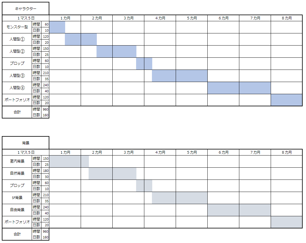 昼間コース同様、基礎から無機物、モンスター・人型キャラクターを段階を追って制作し、