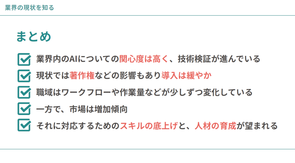 作る人だけでなく、「どこが良いのか」「どこに違和感があるのか」を判断できる人が足りないんですね。だからAIで効率化が進むほど、アウトプットの物量が増えやすくて、チェックの負荷が上がる可能性も出てきます。AIがあるから単純に楽になる、という話ではないと思っています。