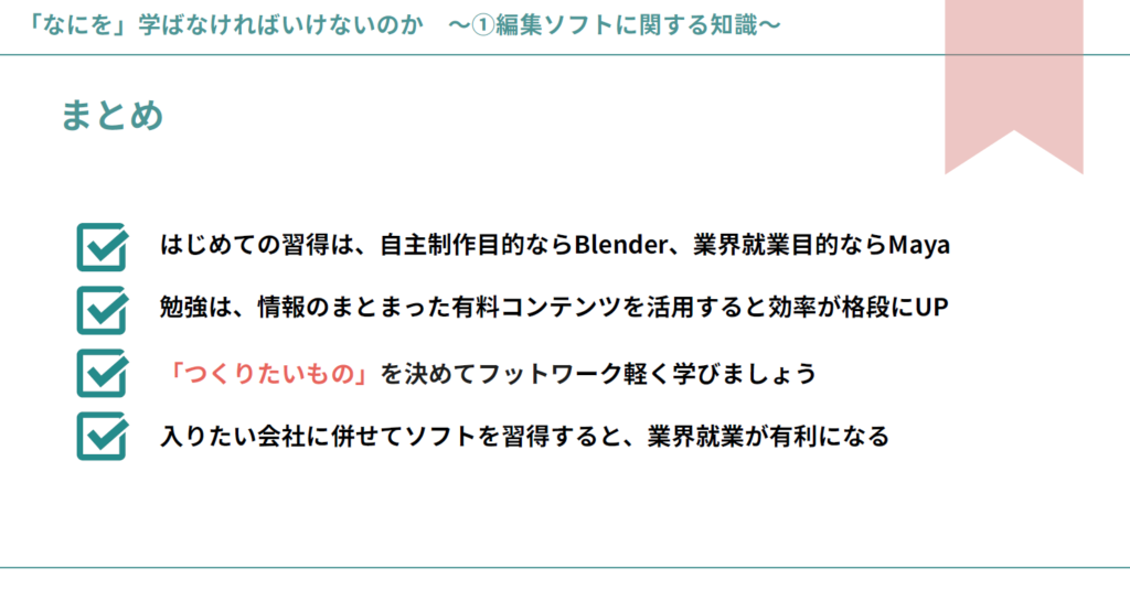 ソフト選びの目安としては、自主制作中心ならBlender、業界就職を強く目指すならMaya。