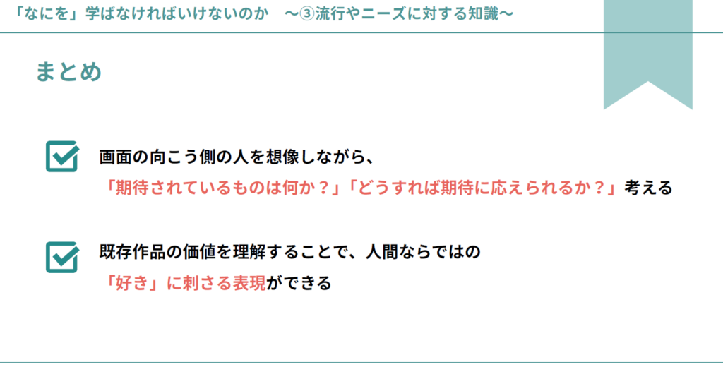 また、就活の場面だと「画面の向こう側の人」は採用担当者です。志望企業がどんな作品を作っていて、何を大事にしているのか。その前提を踏まえて、自分の作品やスキルをどう見せるかを考える。ここまで含めて「ニーズの理解」だと思います。