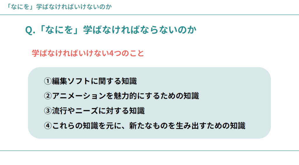 では、「具体的に何を学べばいいのか」です。私は大きく4つに整理しています。