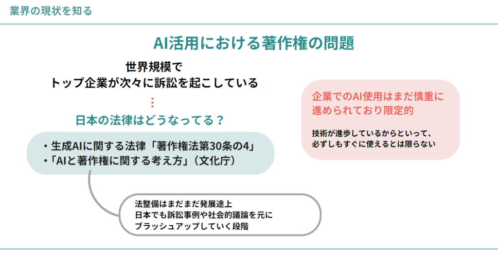 それから、生成AIと著作権の話も避けて通れません。「技術的にできること」と「商用で使えること」は別です。企業は慎重になりやすいので、運用の線引きが重要になります。